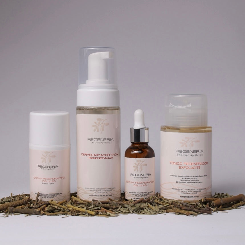 Tónico Regenerador Celular: contiene ácido glicólico, una molécula muy pequeña que penetra a profundidad sin dañar la piel, destapando poros y eliminando células muertas e impurezas profundas.